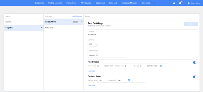 Use the Fees section to set if you charge the customers for not trading, and adjust the specifics, such as when the inactivity fees get charged, custom fee settings per country, etc.
