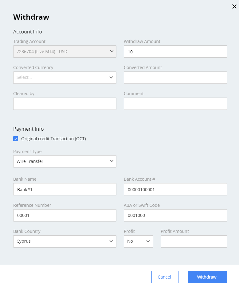 Select the Trading Account to make a withdrawal. If the customer has only one account, it will be selected automatically, and the field will be grayed out.