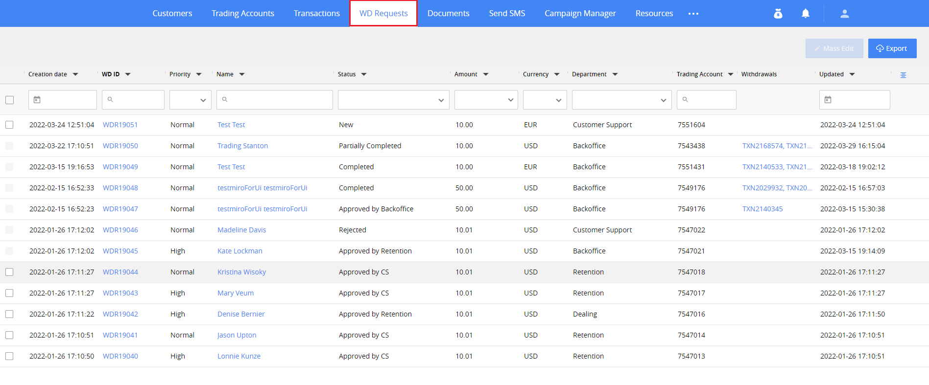 The request should be processed within a specified time to comply with the specific regulations. Before the transaction proceeds, there are different approvals performed by Customer Support, Retention, Dealing, and Backoffice departments. These stages are parts of the WD Request workflow.